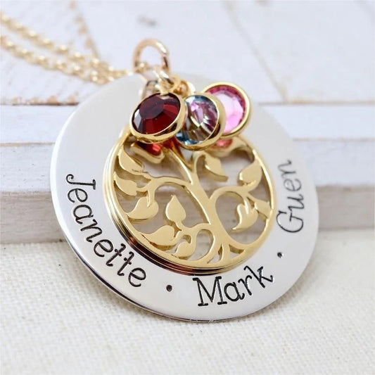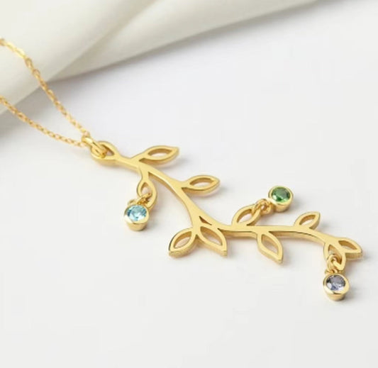 Personalisierte Stammbaum-Halskette mit dem Namen und Geburtsstein des Kindes