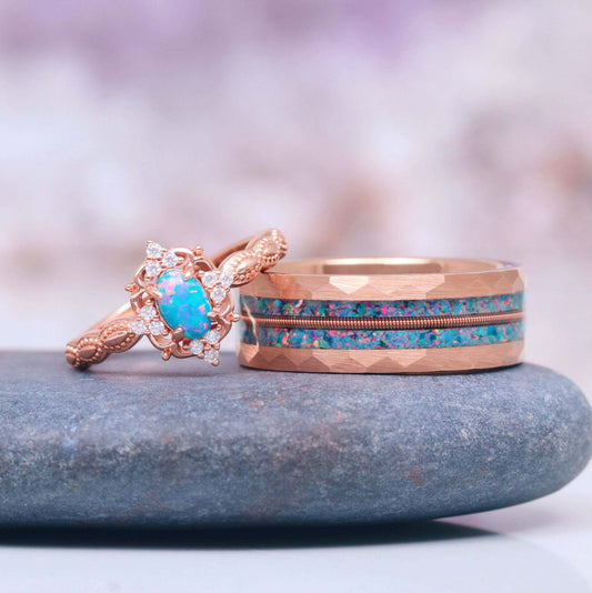 Blue Fire Opal & Guitar String Wedding Band- 8MM Rose Gold Tungsten