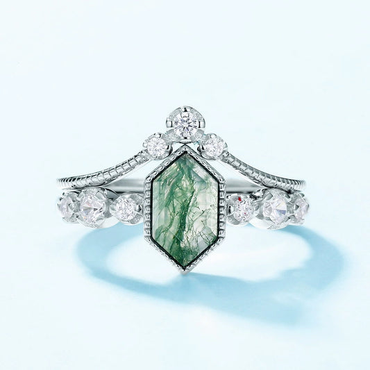 Geometric Natural Green Moss Agate Stackable S925 Sterling Silver Ring Set