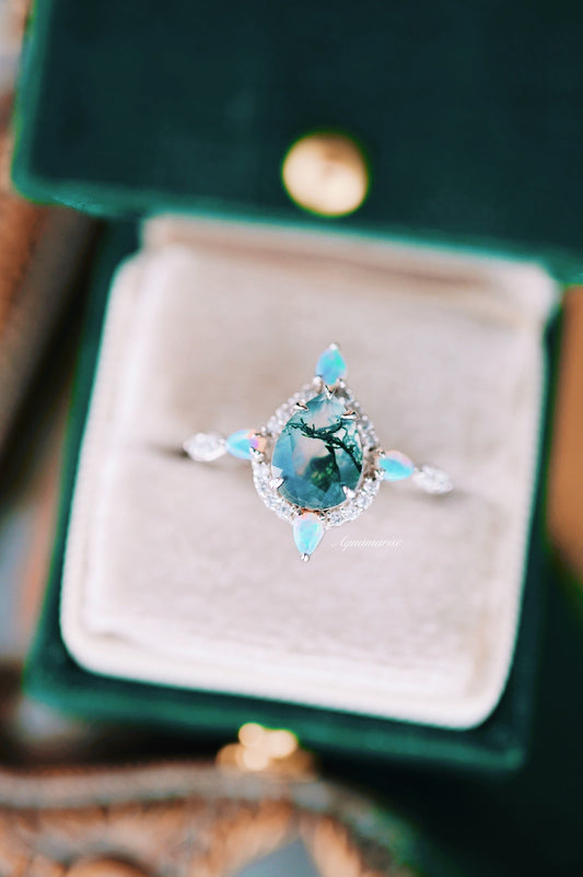 Teardrop Green Moss Agate & Fire Opal Engagement Ring- 925 Sterling Silver