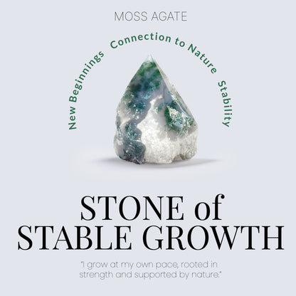 ► Known for its rejuvenating properties, blue goldstone connects you to the energy of the universe, helping to restore vitality and bring a sense of cosmic balance; Moss agate is known for its grounding properties and association with nature’s balance and tranquility. It is believed to bring peace, abundance, and emotional well-being to its wearer.