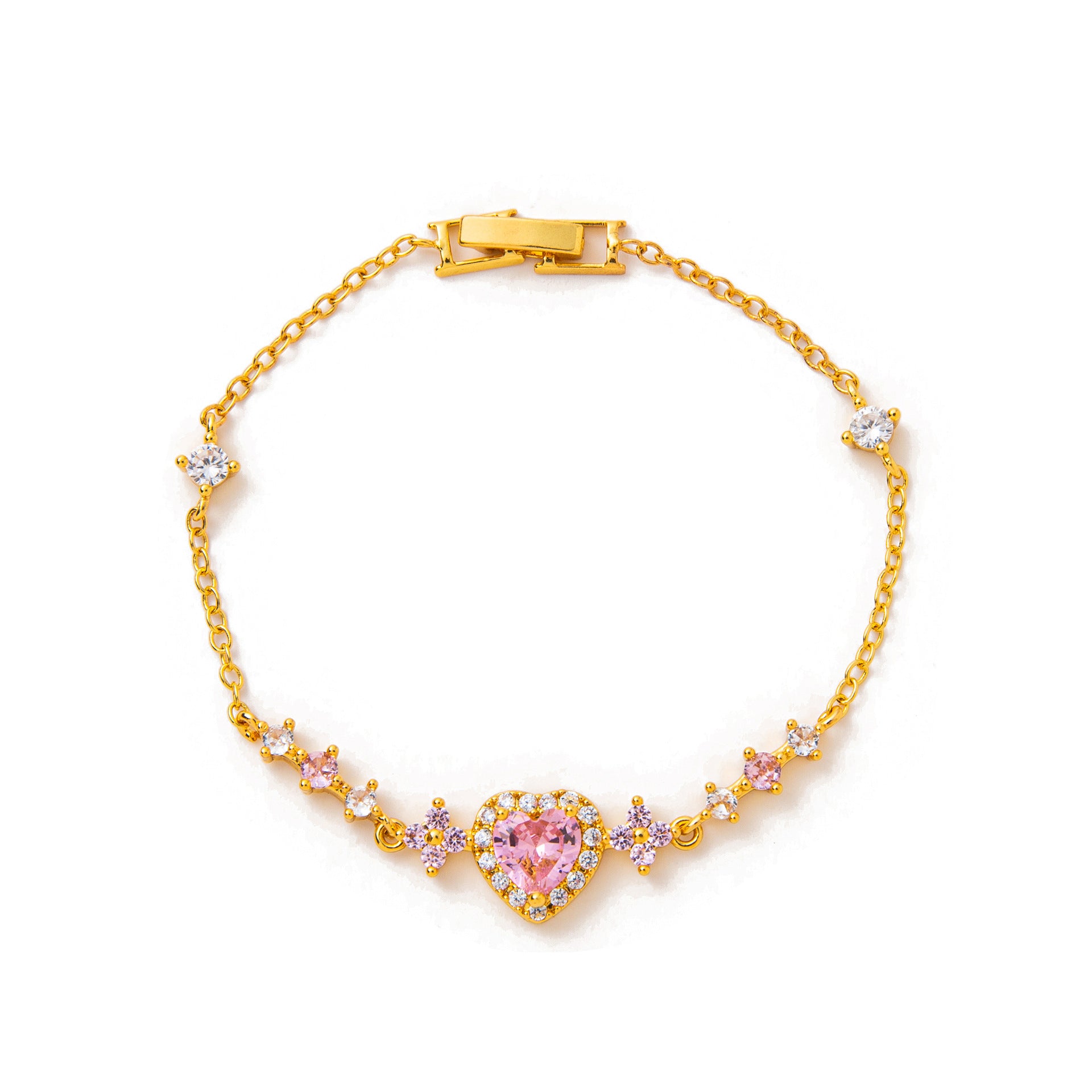 The Sweet Heart Sparkle Bracelet captures the essence of delicate romance. A brilliant pink heart centerpiece is surrounded by shimmering diamond-cut zircon stones that sparkle vividly in every light. The 18K gold-plated finish enhances its warm glow, making it both luxurious and feminine — perfect for pairing with your Sweet Bow Necklace or wearing alone for a touch of refined elegance.