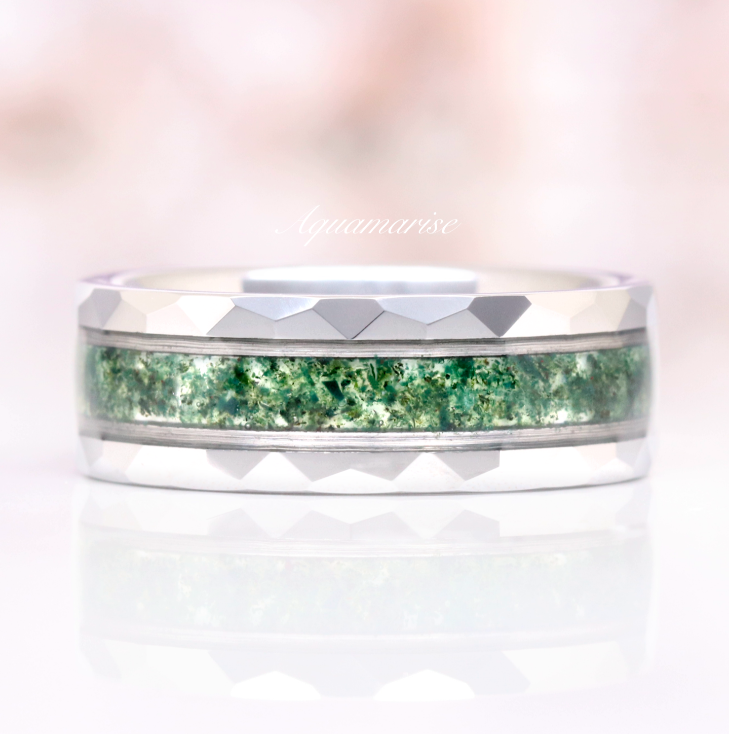 ►Material: Hammered and Polished Tungsten Carbide and Crushed Green Moss Agate Inlay