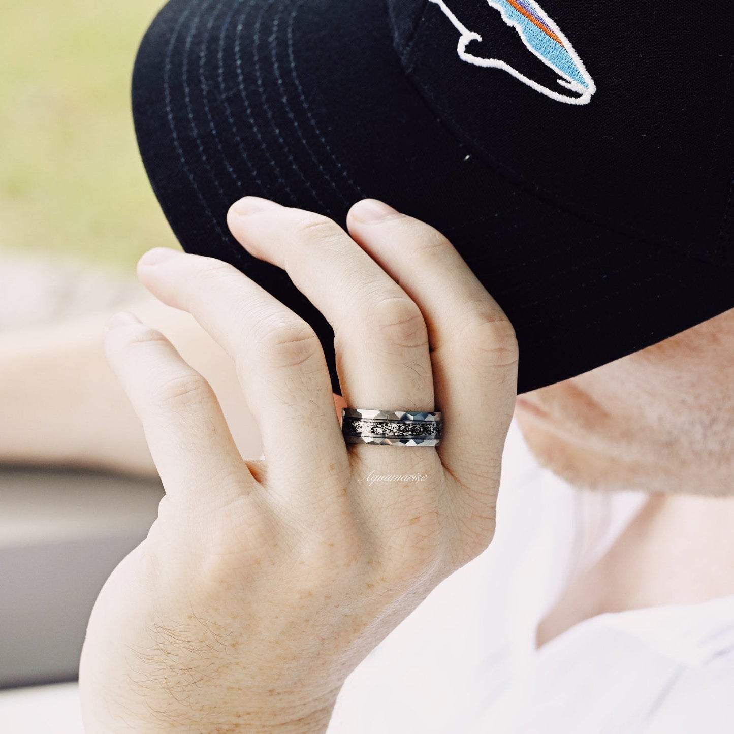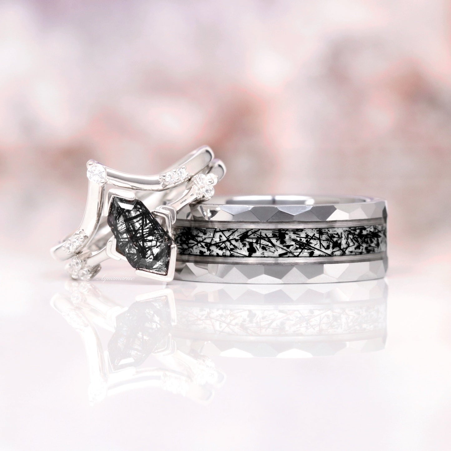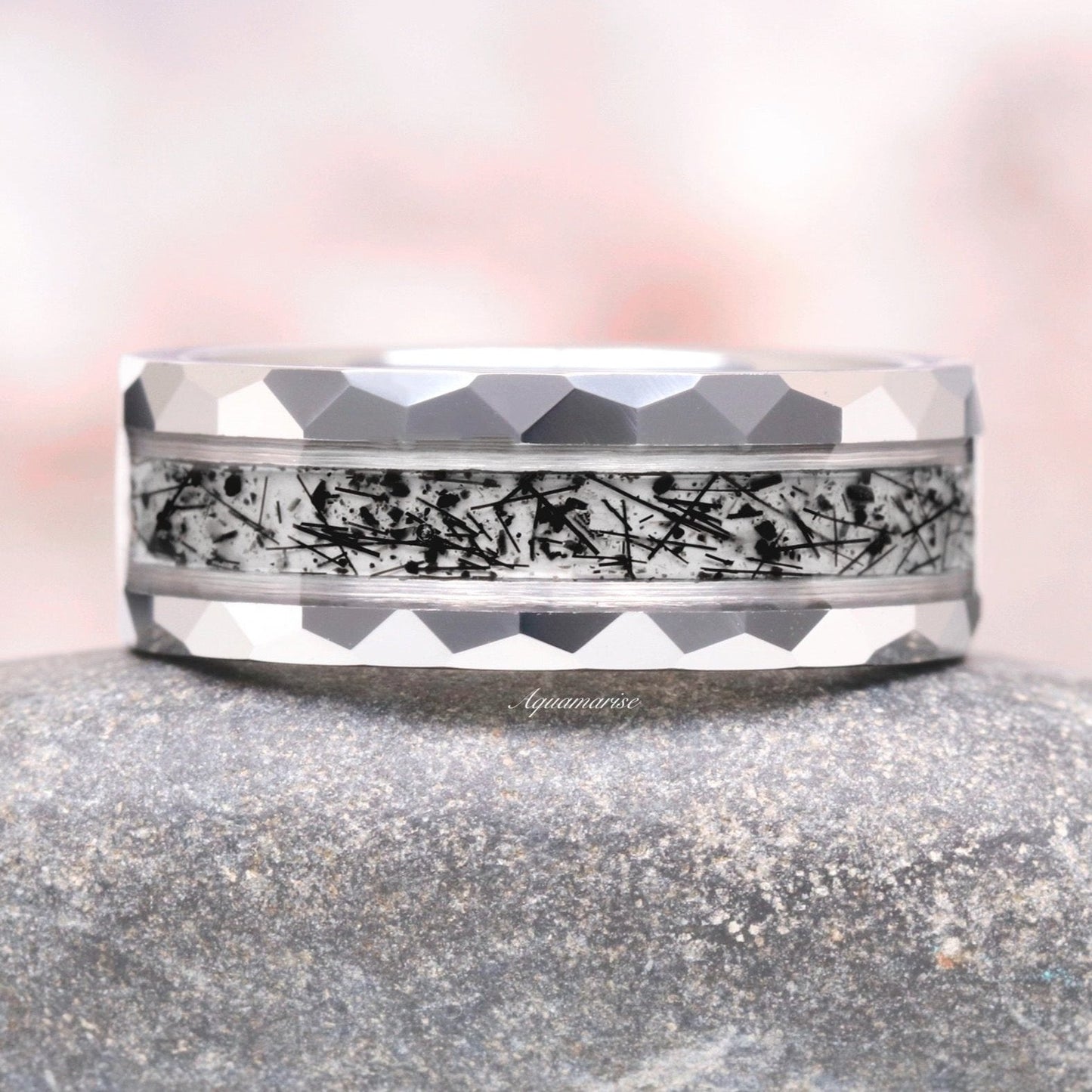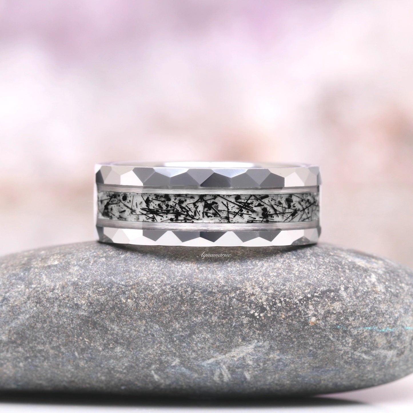 ►Material: Hammered and Polished Tungsten Carbide and Crushed Rutilated Quartz Inlay