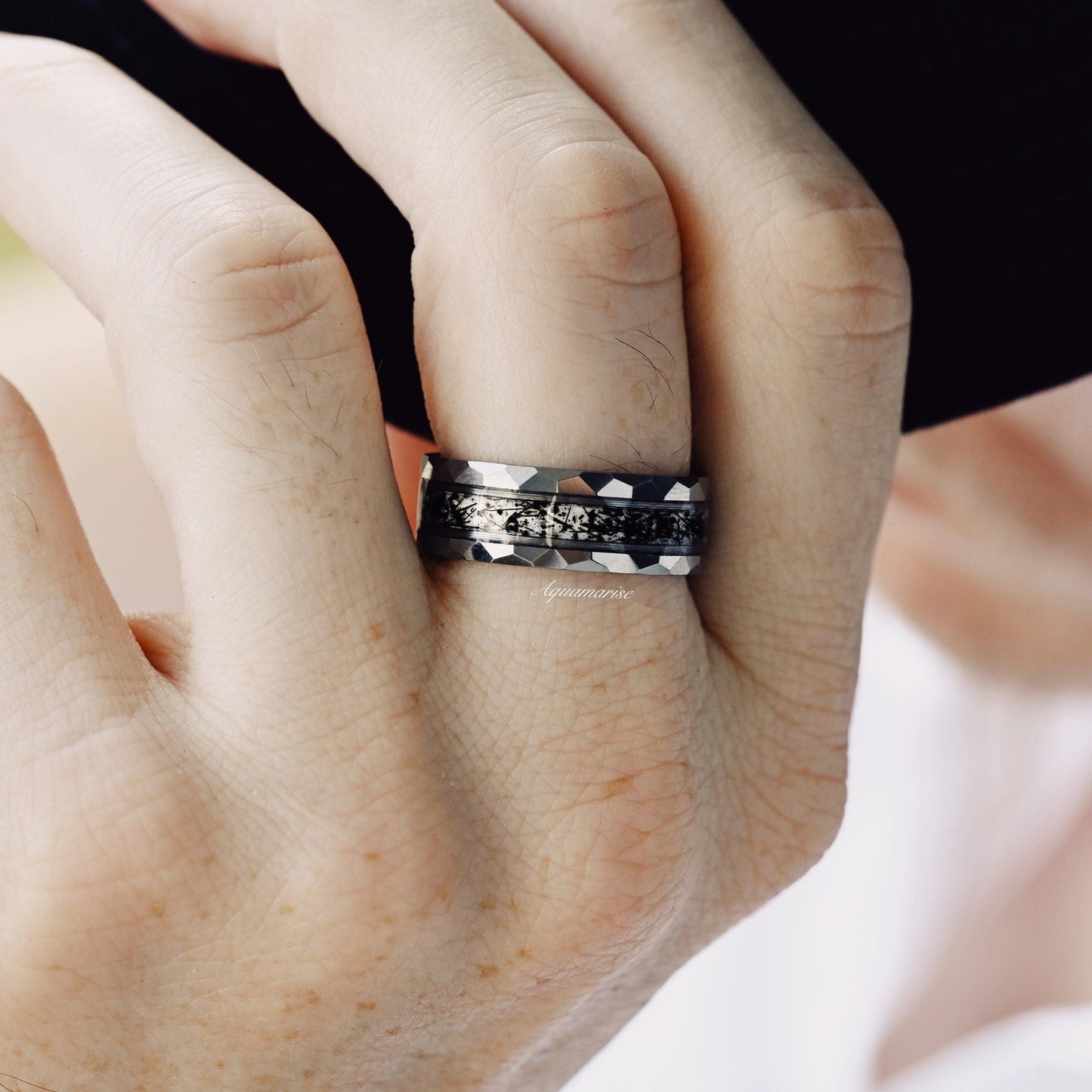 ►Crafted with precision and passion, this wedding band features a striking 8mm wide band made from lustrous hammered silver tungsten. Tungsten is renowned for its strength and resilience, ensuring that your ring will withstand the tests of time and accompany you on every journey of your life together.