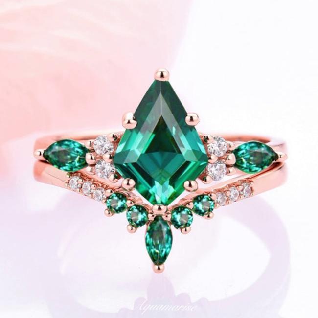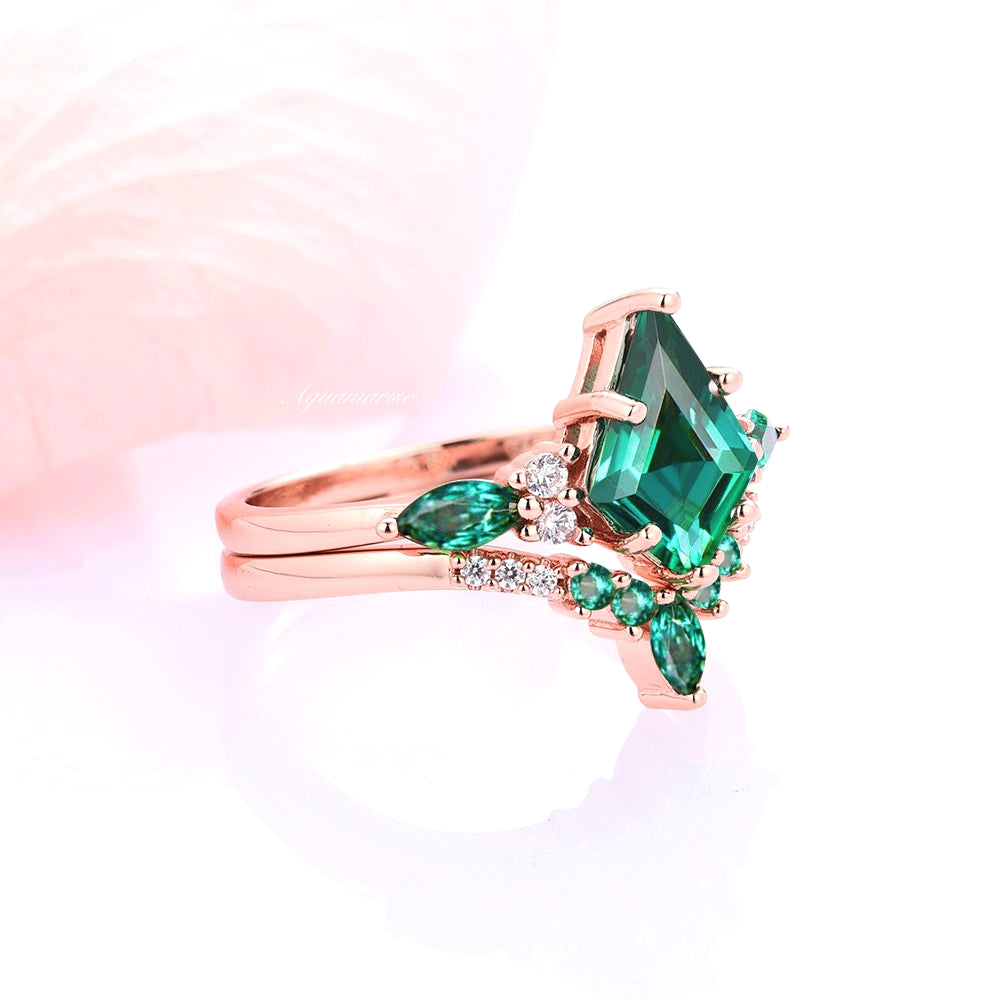 The Skye Emerald vintage-inspired kite ring set for women, crafted in 14K rose gold vermeil. This set features a unique geometric ring design that draws inspiration from the classic kite shape. Let's break down the description: