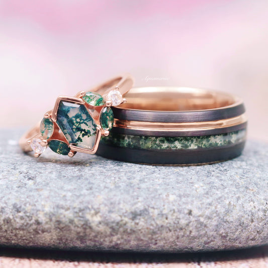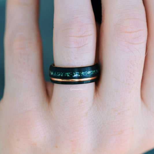 Moss Agate Wedding Band- 8MM Black & Rose Gold Tungsten