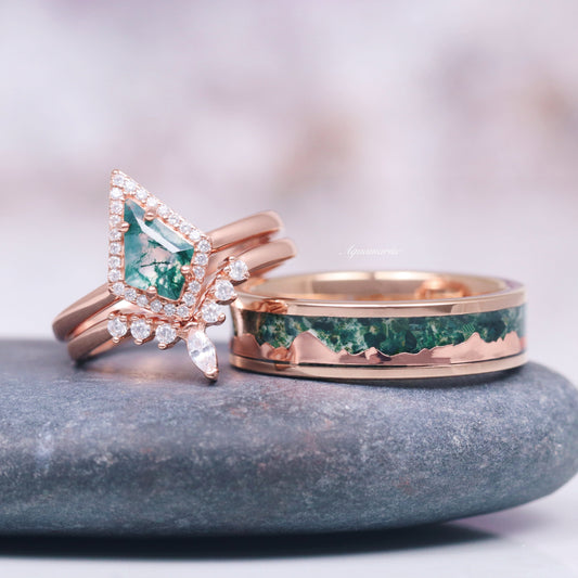 Fairy Green Moss Agate Engagement Leaf Ring Set- 14K White Gold