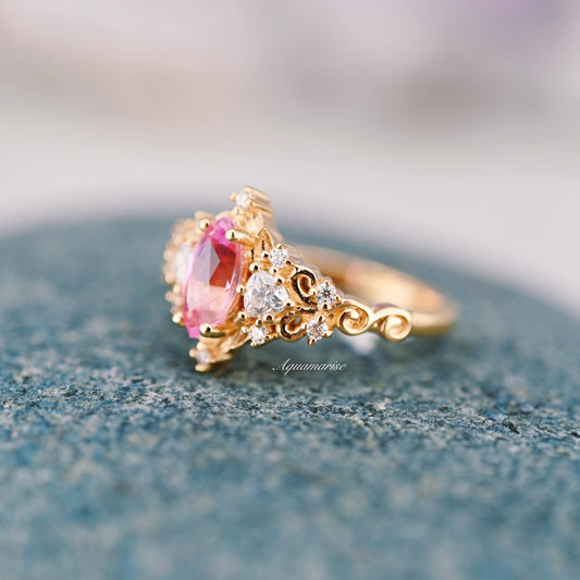 Elain Pink Sapphire Fairy Leaf Engagement Ring- 14K Solid Yellow Gold