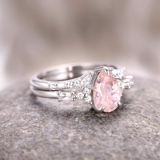 Blush Pink Teardrop Morganite Ring Set- 925 Sterling Silver