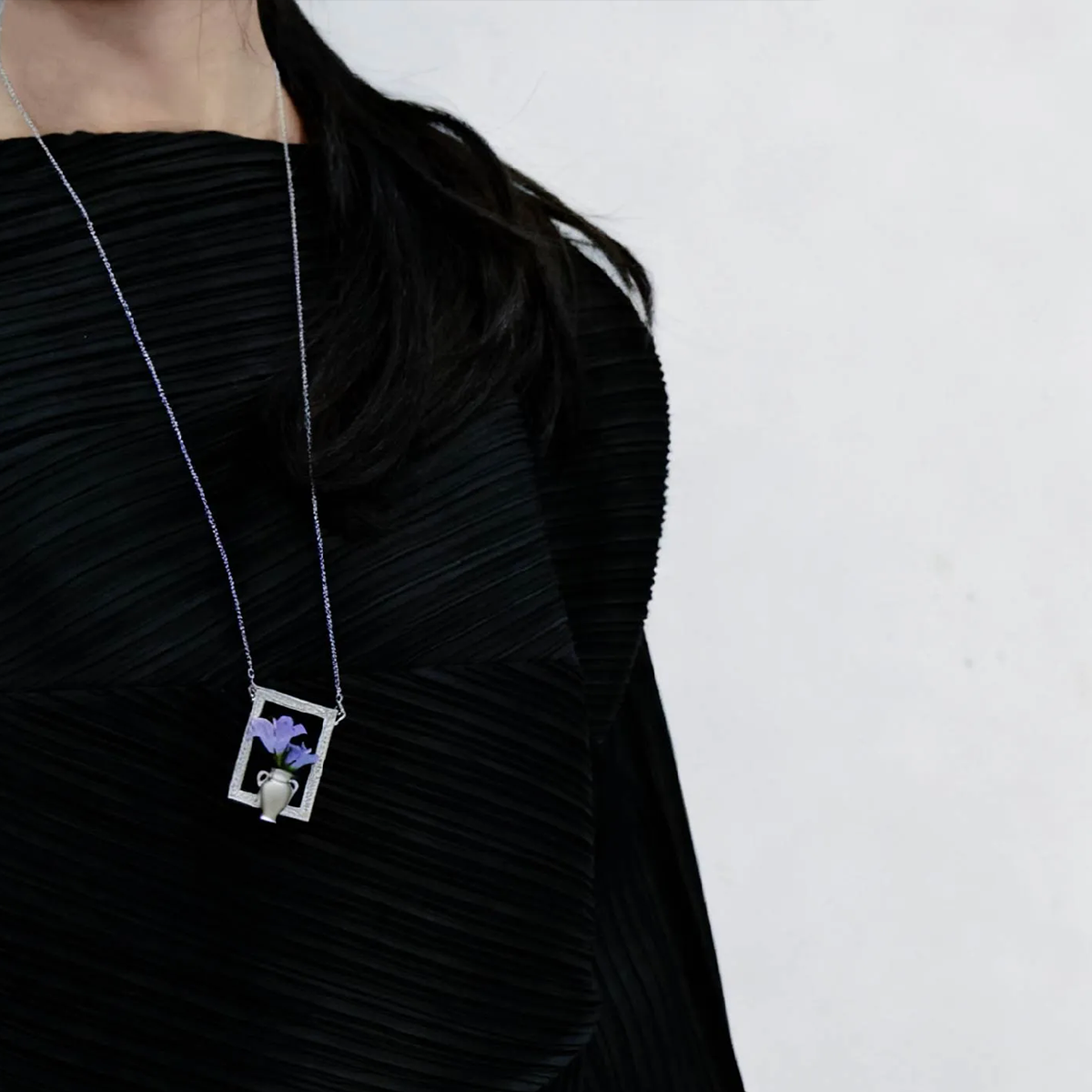 Inspired by classic window frames and miniature vases, the brooch feels like a small still-life painting brought to life. The little vase creates dimension and allows the flower you place inside to become the true centerpiece—alive, delicate, and meaningful.