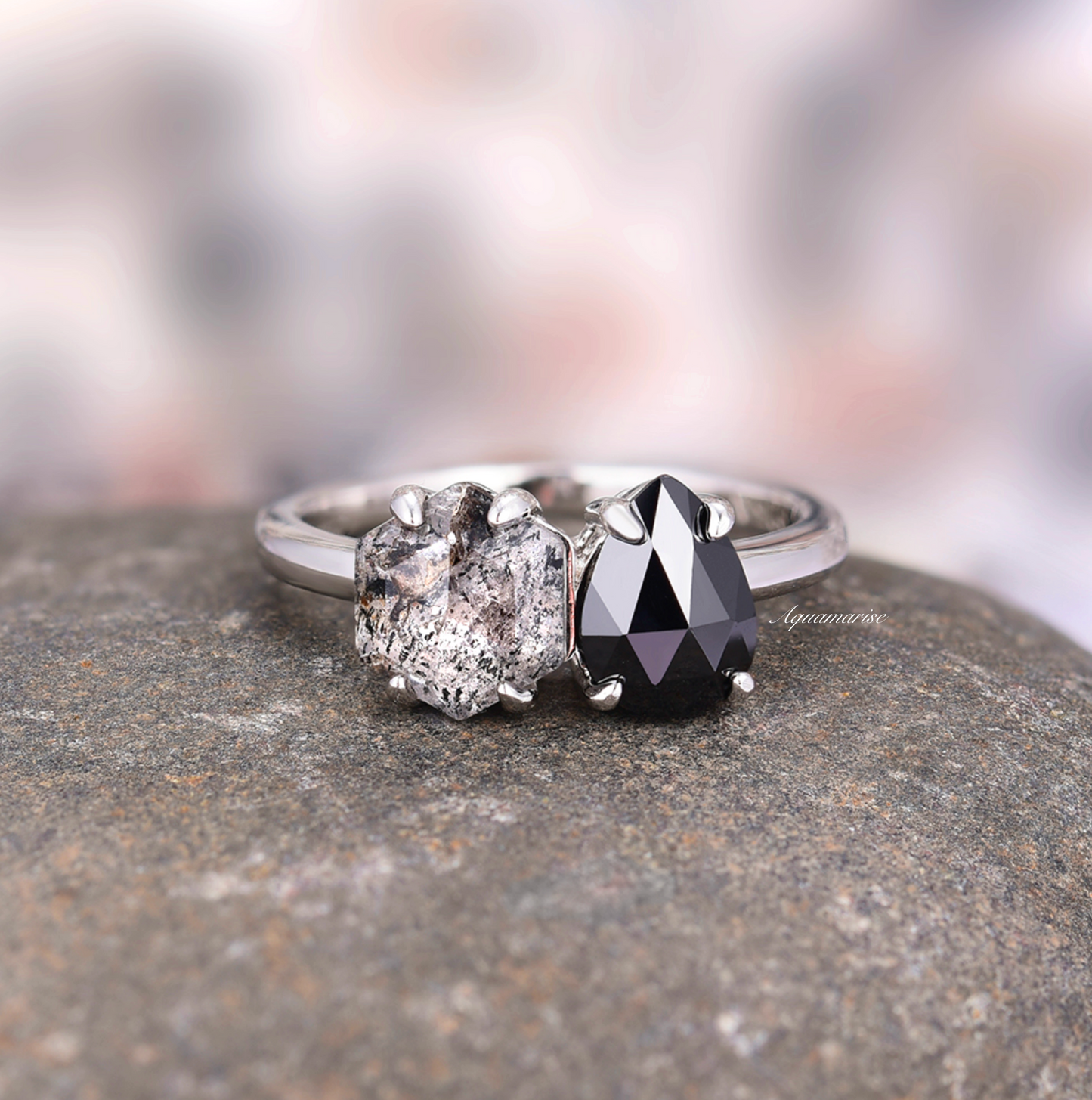 'Toi Et Moi' Salt & Pepper (Herkimer Diamond) & Black Black Onyx Ring- 925 Sterling Silver