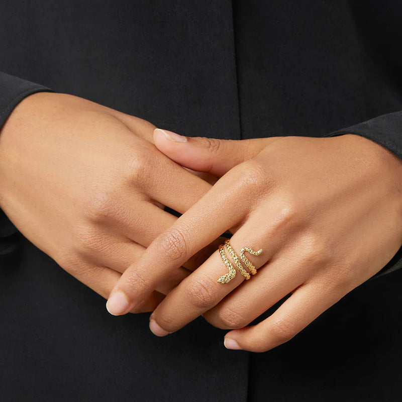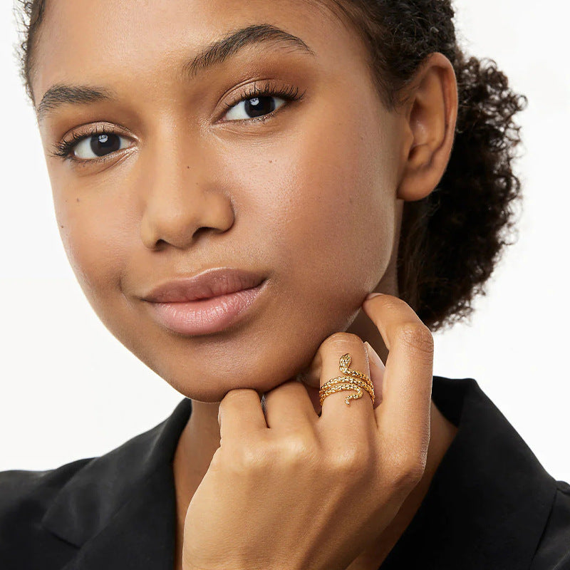 This Gold Snake Wrap Ring is a true statement of artistry — meticulously handcrafted to capture the intricate, lifelike texture of snake scales. Designed with precision, it wraps gracefully around your finger, offering an adjustable fit that ensures both comfort and a secure hold.