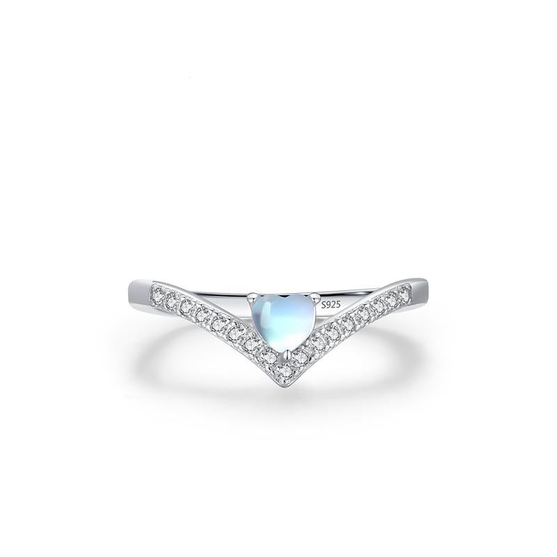 The ring features a heart-shaped moonstone framed by a soft V-shaped arc of cubic zirconia, reflecting gentle radiance with every turn of the hand. The matching earrings pair minimalist silver hoops with luminous moonstone drops, creating an elegant movement of light.