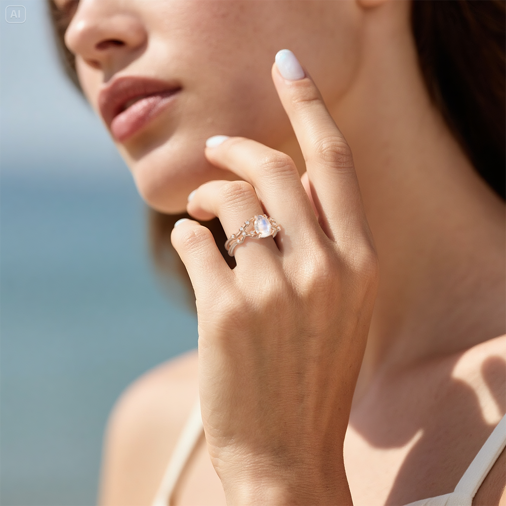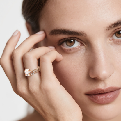 At its center lies a radiant moonstone that reflects a soft, mystical glow. The sleek rose gold band enhances the stone’s beauty with a modern and refined look, balancing classic charm with contemporary style.