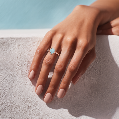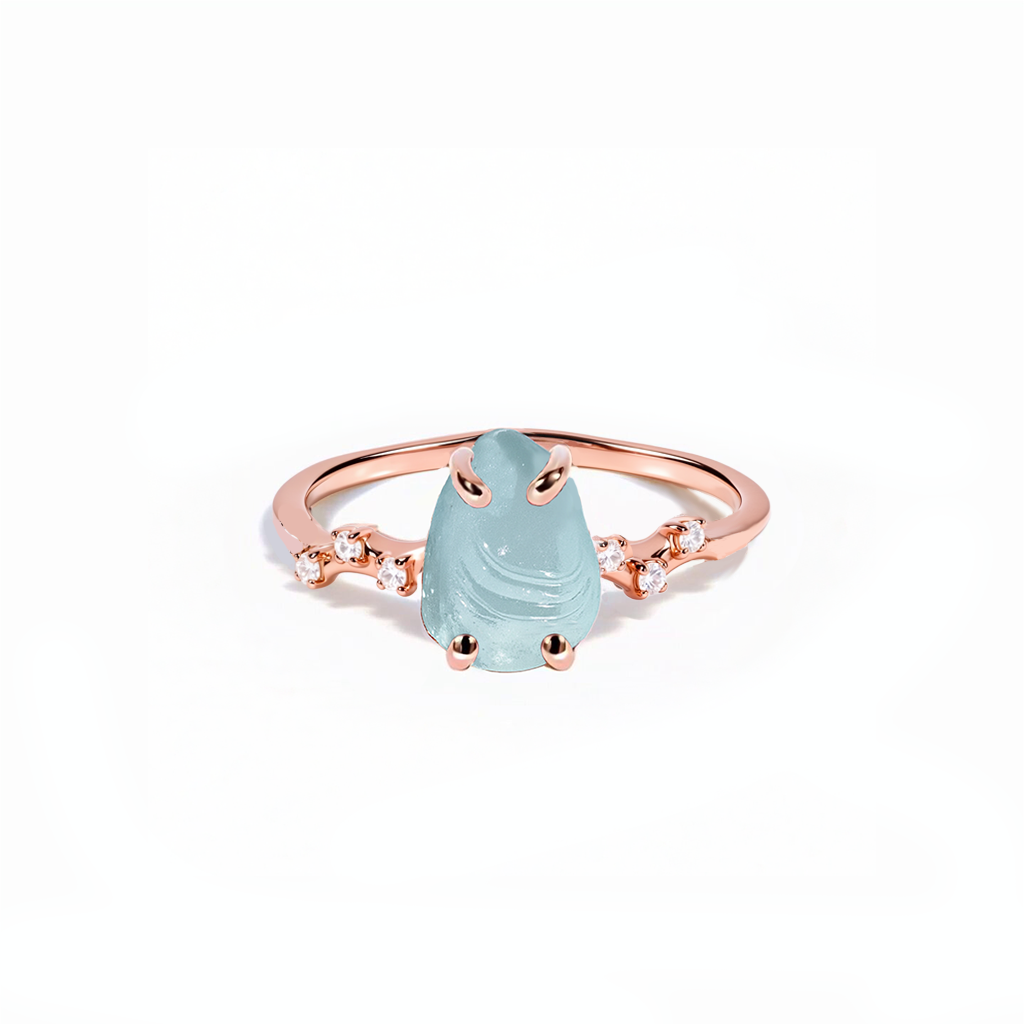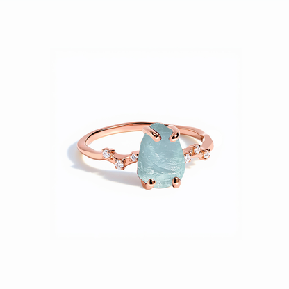 At the heart of the ring lies a captivating aquamarine, whose light blue hue resembles the clear waters of the ocean, exuding a sense of tranquility and elegance. The stone is gracefully held by four prongs, allowing maximum light to pass through and enhance its natural beauty. The band, embellished with small, sparkling diamonds, complements the aquamarine perfectly, adding a touch of glamour. The 18K rose gold plating gives the ring a luxurious and refined look.
